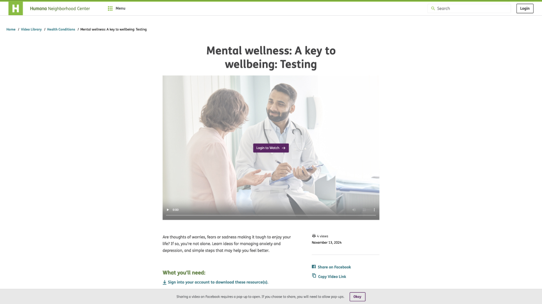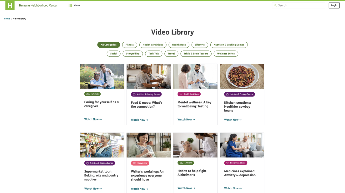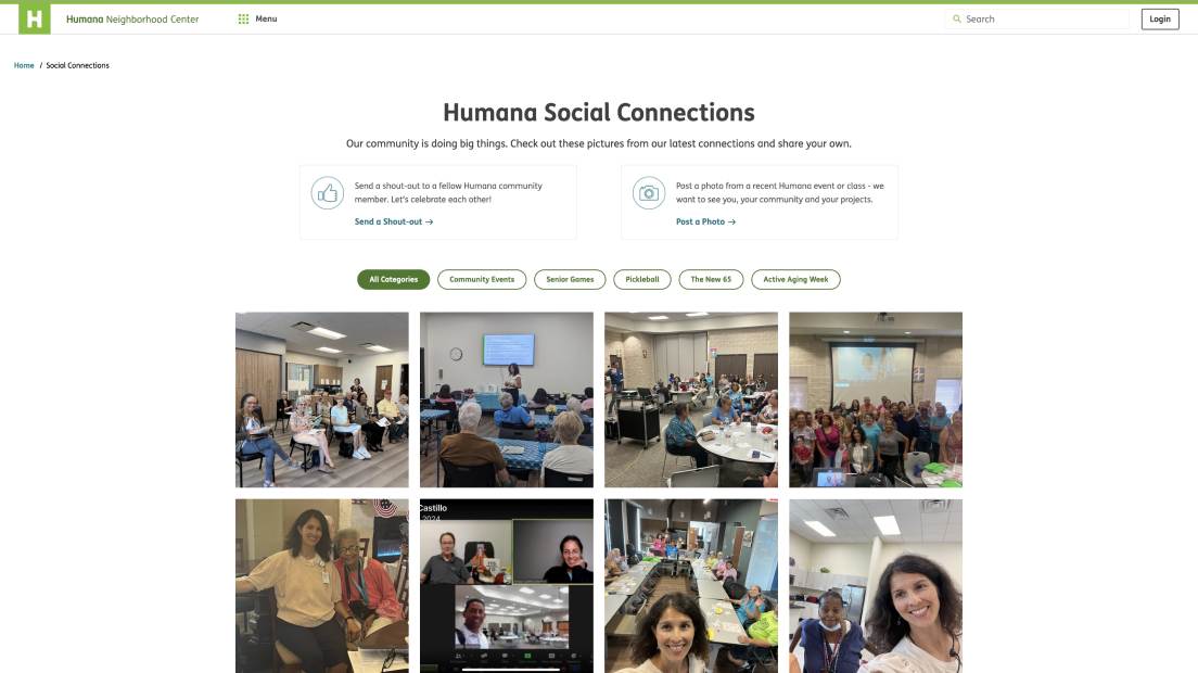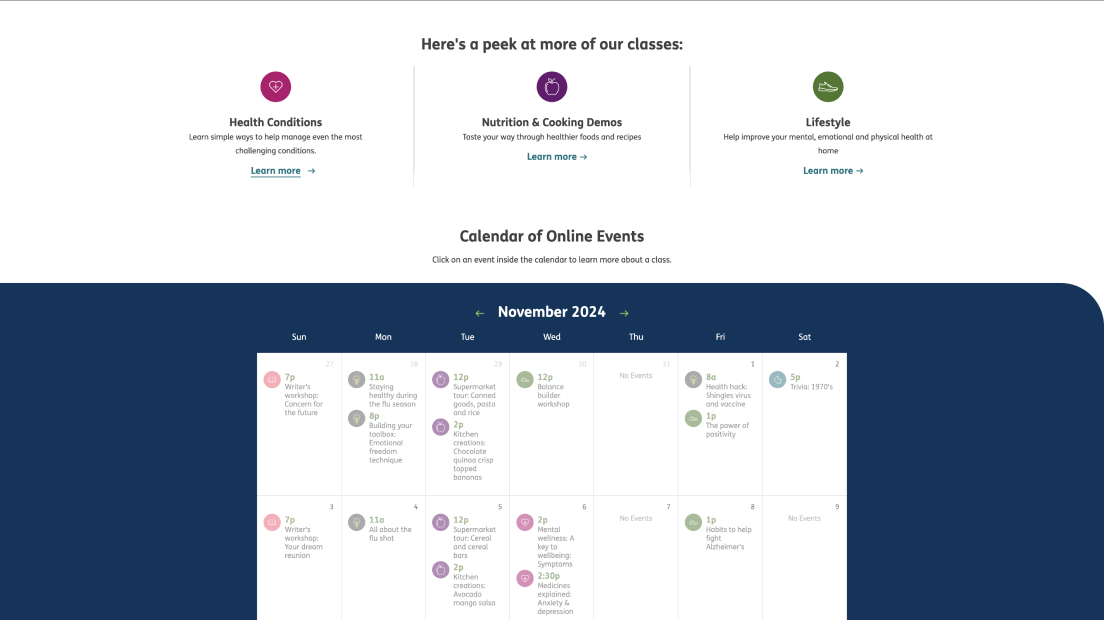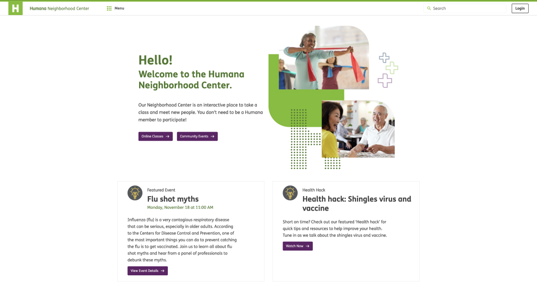 As the initial lead front-end developer, I helped launch the Humana Neighborhood Center website, a digital platform built to educate and connect clients through online seminars, videos, and virtual events. Developed using .NET, HTML, SCSS, vanilla JavaScript, jQuery, and Calendar.js, the site features RSVP functionality, a downloadable event calendar, live chat, and location-based event filtering by ZIP code. Integrated third-party platforms like Zoom and Facebook for virtual sessions. The site runs on an Umbraco CMS, allowing Humana to easily manage events that auto-populate across the site. I later transitioned off the project to support other initiatives.